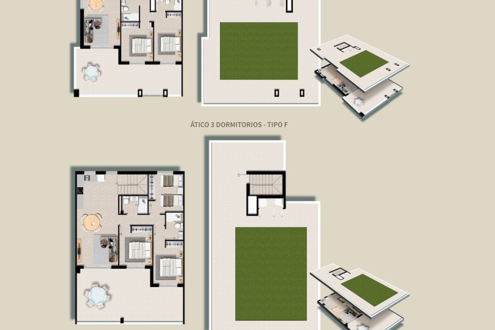 Ezeknek az ingatlanoknak a belső tere gondosan megtervezett, hogy modern és funkcionális környezetet biztosítson. A porcelán padlók eleganciát és tartósságot kölcsönöznek, míg az elektromos redőnyök kényelmet és energiahatékonyságot nyújtanak. A konyhák magas minőségű készülékekkel vannak felszerelve, megkönnyítve a mindennapokat. A beépített szekrények optimalizálják a tárolóhelyet, fenntartva a rendet és az esztétikát. Az elrendezés 2 vagy 3 hálószobás és 2 vagy 3 fürdőszobás opciókat tartalmaz, különböző életstílusokhoz igazodva.
