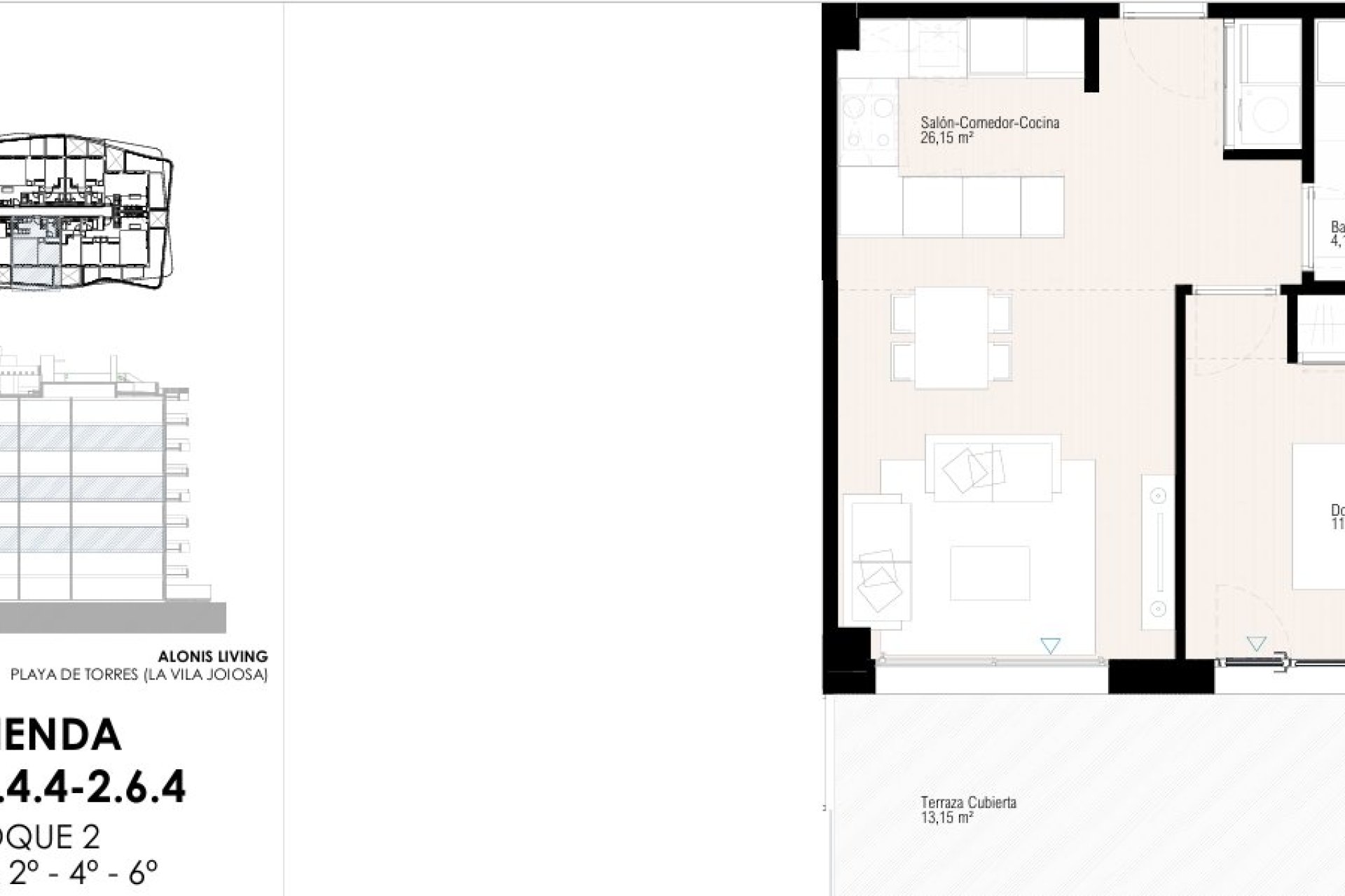 A bájos La Vila Joiosa városában található ez a lakópark, amely különféle lakhatási lehetőségeket kínál, amelyek különböző igényekhez és életstílusokhoz igazodnak. Összesen 71 egységgel a jövőbeli lakók választhatnak apartmanok, földszinti és tetőtéri lakások közül, amelyek mindegyike a kényelem és a funkcionalitás maximalizálására lett tervezve. A tenger közelsége, mindössze 400 méterre, lehetővé teszi a tengeri szellő és a lenyűgöző kilátás élvezetét, ideális menedéket nyújtva azoknak, akik nyugodt és természetes környezetet keresnek. A tipológiák sokfélesége biztosítja, hogy minden család vagy egyén számára megfelelő lehetőség álljon rendelkezésre, egytől három szobáig és egy vagy két fürdőszobával, a választás szerint.