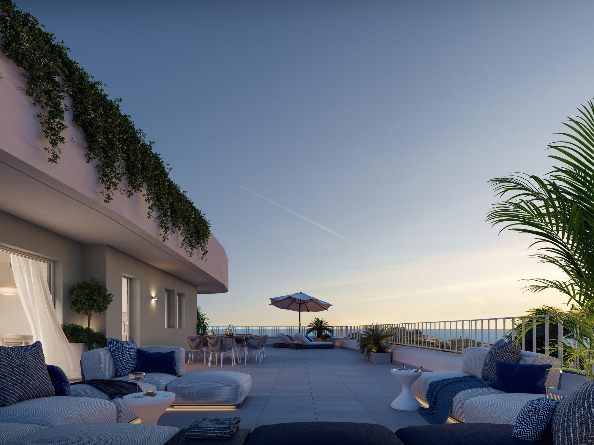 Zewnętrzny design nieruchomości w tej rezydencji został zaprojektowany, aby zapewnić wyjątkowe doświadczenie życia na świeżym powietrzu. Tarasy, obecne w wielu mieszkaniach, pozwalają cieszyć się śródziemnomorskim klimatem i widokiem na morze. Ponadto niektóre typy obejmują solarium, zapewniając dodatkową przestrzeń do relaksu i rozrywki na świeżym powietrzu. Społeczność posiada rozległe tereny zielone, które zachęcają do spacerów i cieszenia się naturą bez wychodzenia z domu. Wspólny basen to kolejna atrakcja, idealna do ochłody w ciepłe letnie dni.