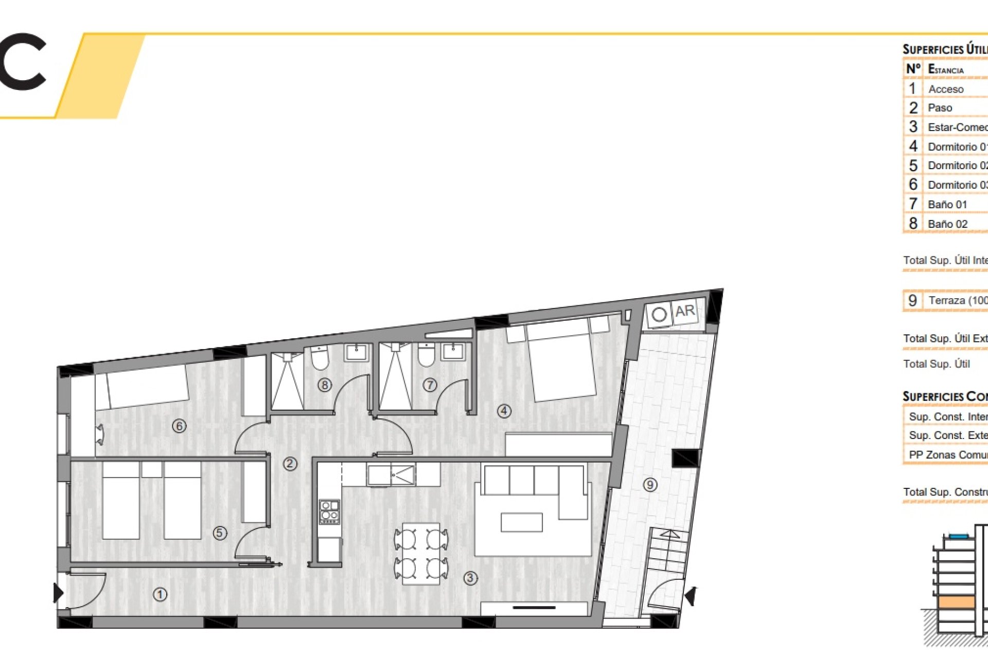 Wewnątrz apartamenty na poddaszu wyróżniają się nowoczesnym i funkcjonalnym designem. Podłogi z gresu porcelanowego dodają elegancji i są łatwe w utrzymaniu. Układ obejmuje opcje z 2 lub 3 sypialniami, dostosowane do różnych potrzeb rodzinnych, oraz 2 łazienki zapewniające komfort wszystkim mieszkańcom. Wbudowane szafy oferują efektywną przestrzeń do przechowywania, a włączenie sprzętu AGD w kuchni ułatwia codzienne życie. Możliwość opcjonalnego garażu dodaje element personalizacji zgodnie z preferencjami każdego kupującego.