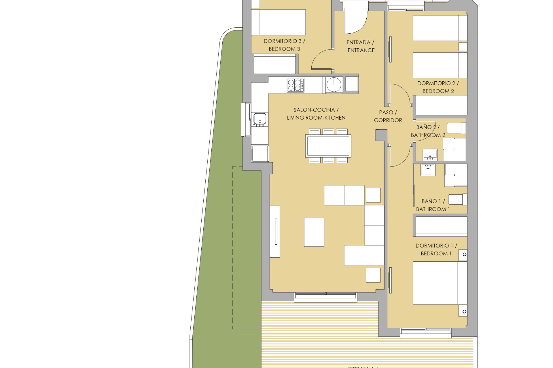 The exteriors of these homes are designed to maximize enjoyment of the Mediterranean climate. Each property features a terrace, ideal for outdoor relaxation or al fresco dining. Additionally, some types include a solarium, providing extra space for sunbathing or creating a private resting area. Gardens, present in certain configurations, offer a touch of nature and a perfect space for outdoor activities. The inclusion of pergolas in the exteriors adds an element of shade and style, allowing enjoyment of the outdoors even on the sunniest days.