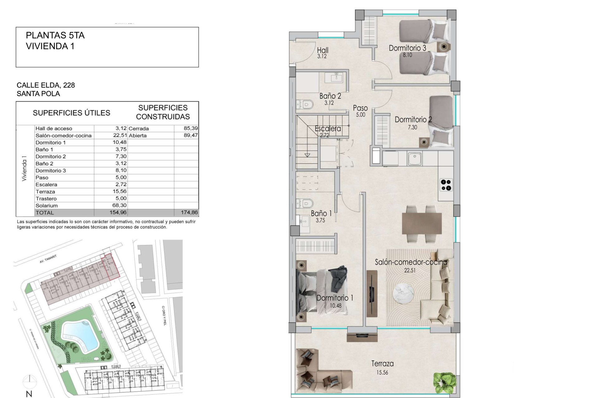 Located in the charming town of Santa Pola, this residential complex offers a selection of 80 properties, including apartments and penthouses, designed for those seeking a home with sea views. The proximity to the sea, just 1 km away, allows for the enjoyment of the sea breeze and unparalleled coastal landscapes. Additionally, its proximity to the airport, just 15 km away, facilitates access and mobility for residents and visitors. The properties are equipped with modern features such as built-in wardrobes and ceramic floors, ensuring comfort and style in every corner.