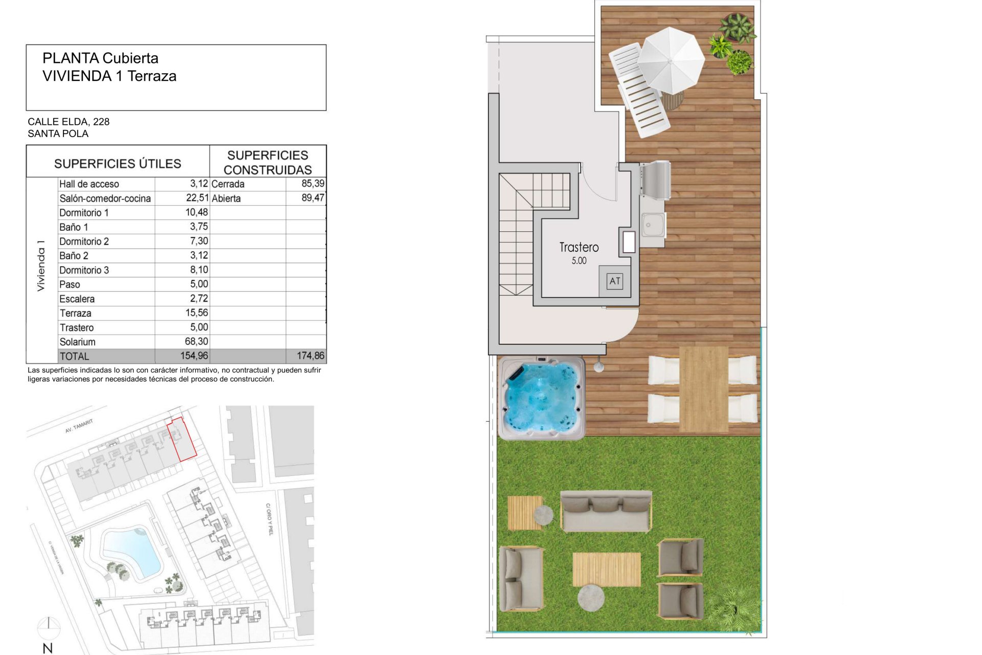 The outdoor areas of this residential complex in Santa Pola are designed to maximize enjoyment of the Mediterranean environment. The properties feature terraces offering sea views, ideal for outdoor relaxation. Additionally, some types include solariums, providing additional space for leisure and relaxation under the sun. The inclusion of pergolas and jacuzzis in certain units adds a touch of luxury and comfort, allowing residents to enjoy moments of relaxation in the privacy of their home.
