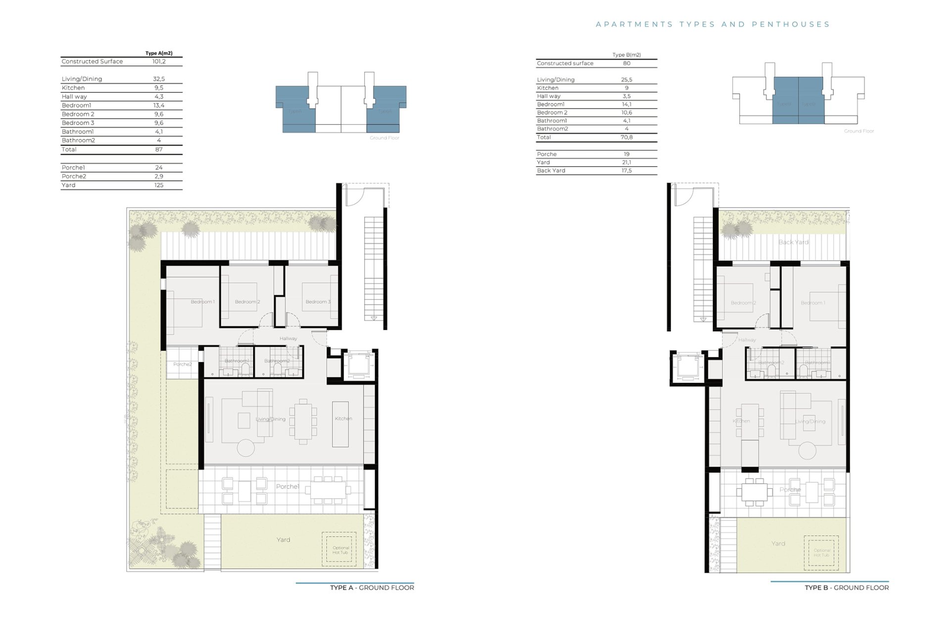 The interiors of these homes are carefully designed to offer comfort and modernity. Apartments, ground floors, and penthouses are available in 2 and 3-bedroom configurations, all with 2 bathrooms. The kitchens are fully equipped with modern appliances, and the homes come furnished, ready to move in. The climate control system includes air conditioning and underfloor heating, ensuring comfort throughout the year. Ceramic and porcelain tile floors add a touch of sophistication and are easy to maintain. Electric shutters and a video intercom add an extra level of convenience and security.