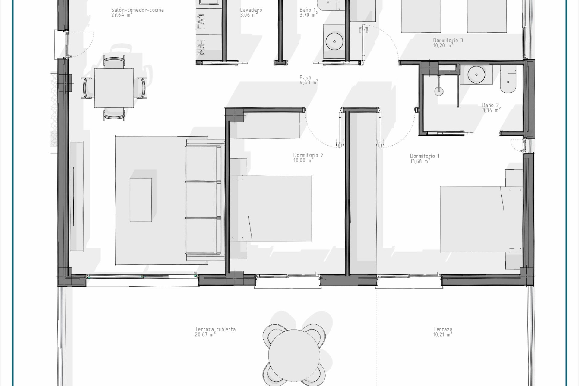 The exteriors of this residential complex are designed to offer a pleasant and functional environment. The properties feature private terraces, perfect for enjoying the Mediterranean climate and outdoor moments. Additionally, some typologies include private gardens, providing extra space for leisure and relaxation. The presence of a solarium in certain homes allows for panoramic views and sun enjoyment year-round. Access to a private garage ensures convenience and security for residents' vehicles. This set of exterior features makes each home a personal and welcoming retreat.